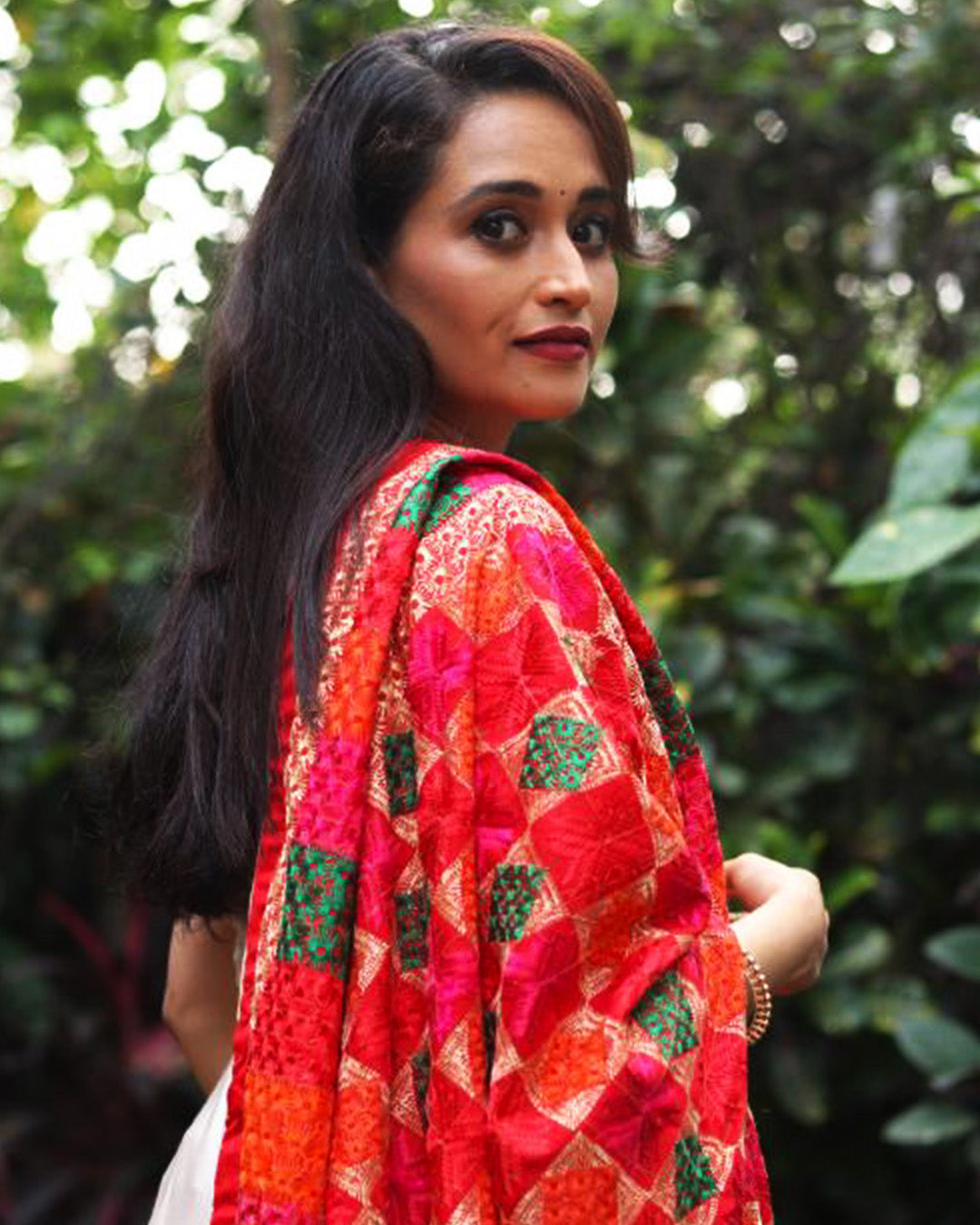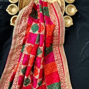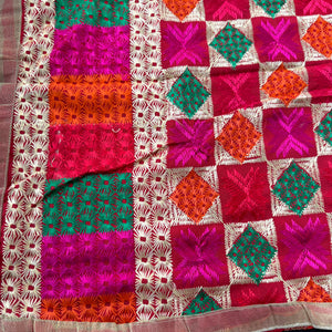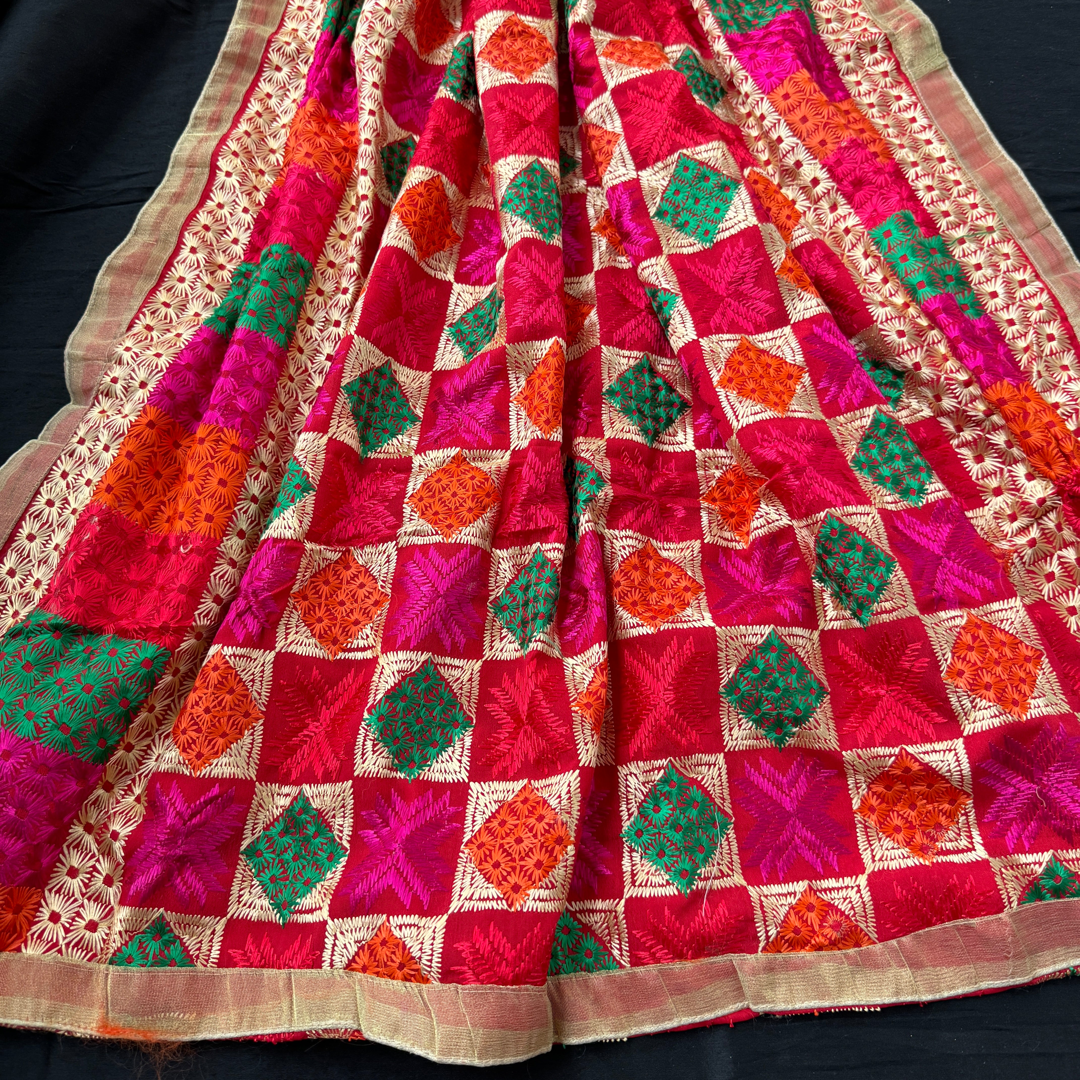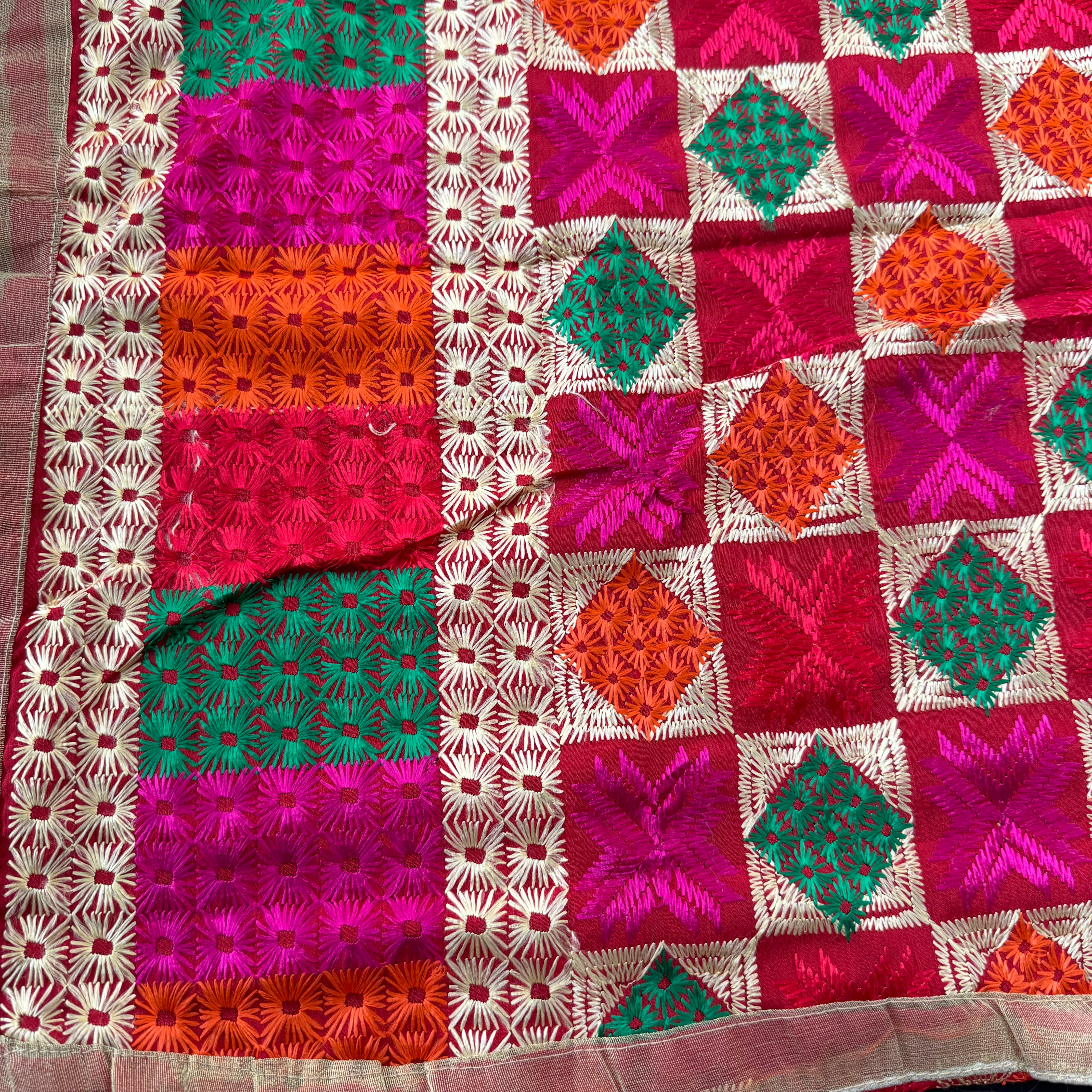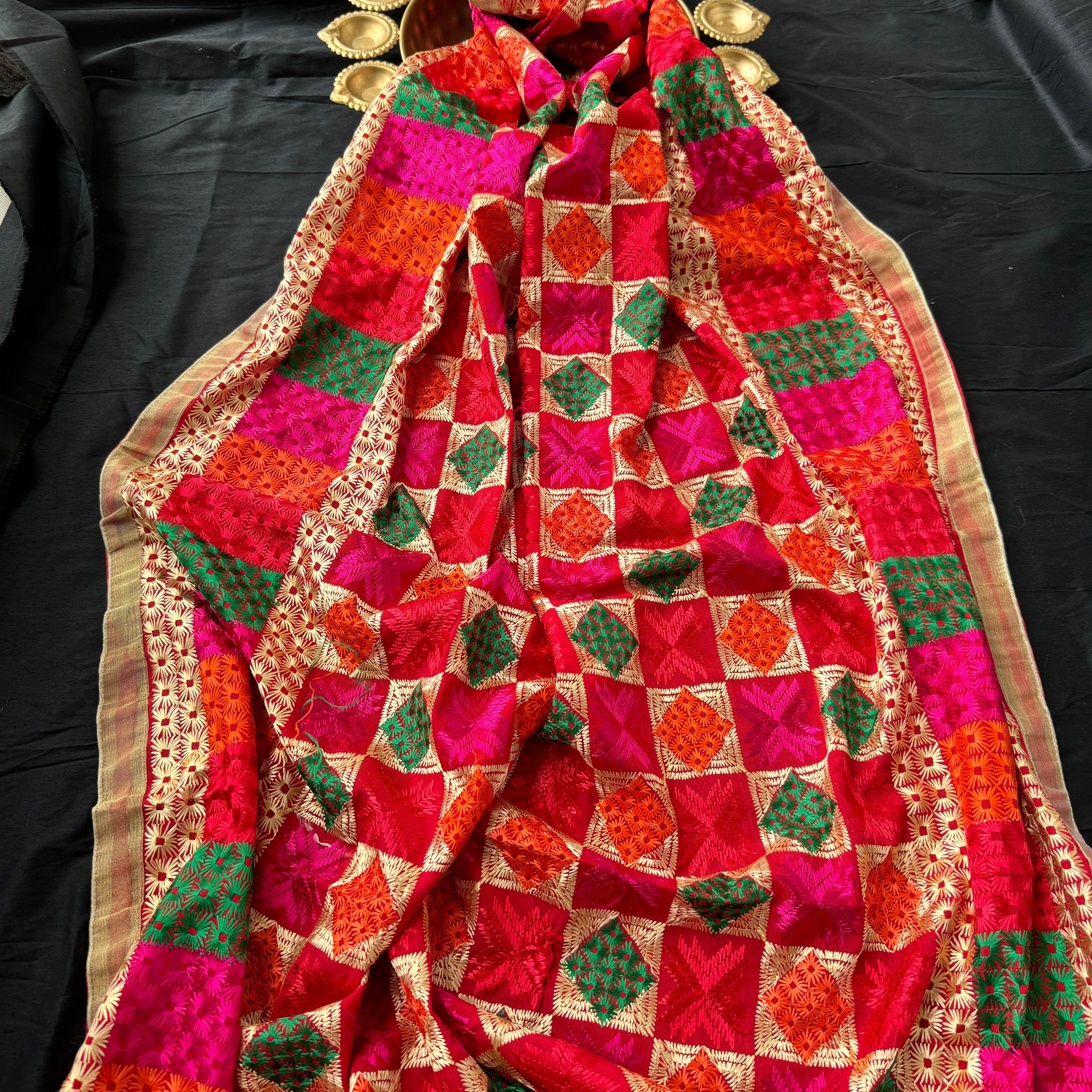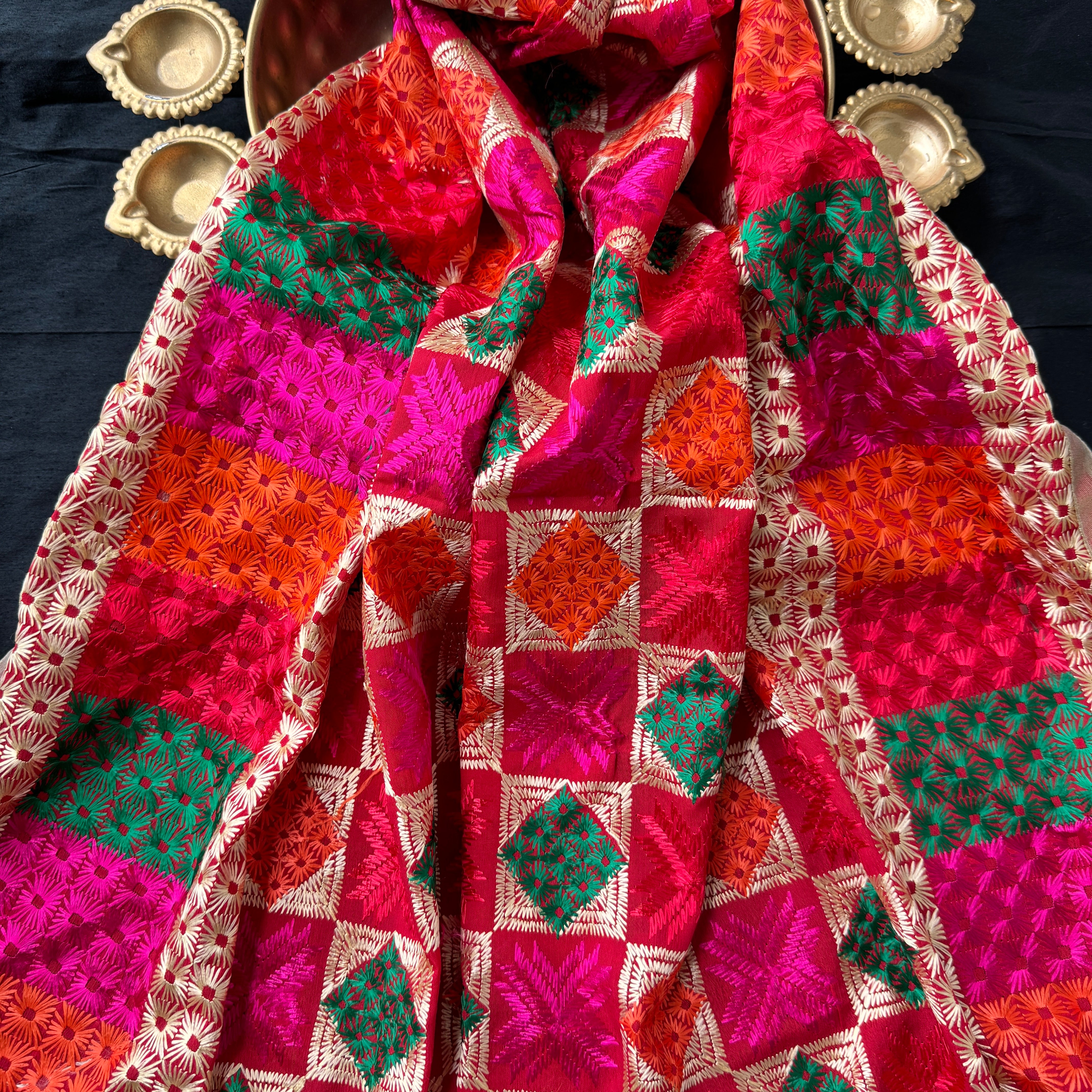 This sparkly phulkari dupatta with multicoloured threadwork for a dazzling look. Ideal for all occasions.is ideal for small celebration or traditional occasion. It has a Red base with floral motifs machine-embroidered in multicoloured thread on the entire fabric. Pair it with a lehenga or kurta. Add oodles of elegance with this dupatta.