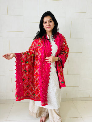 This sparkly phulkari dupatta with multicoloured threadwork for a dazzling look. Ideal for all occasions.is ideal for small celebration or traditional occasion. It has a Red base with floral motifs machine-embroidered in multicoloured thread on the entire fabric. Pair it with a lehenga or kurta. Add oodles of elegance with this dupatta.