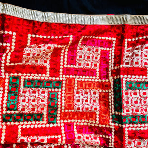 This sparkly phulkari dupatta with multicoloured threadwork for a dazzling look. Ideal for all occasions.is ideal for small celebration or traditional occasion. It has a Red base with floral motifs machine-embroidered in multicoloured thread on the entire fabric. Pair it with a lehenga or kurta. Add oodles of elegance with this dupatta.