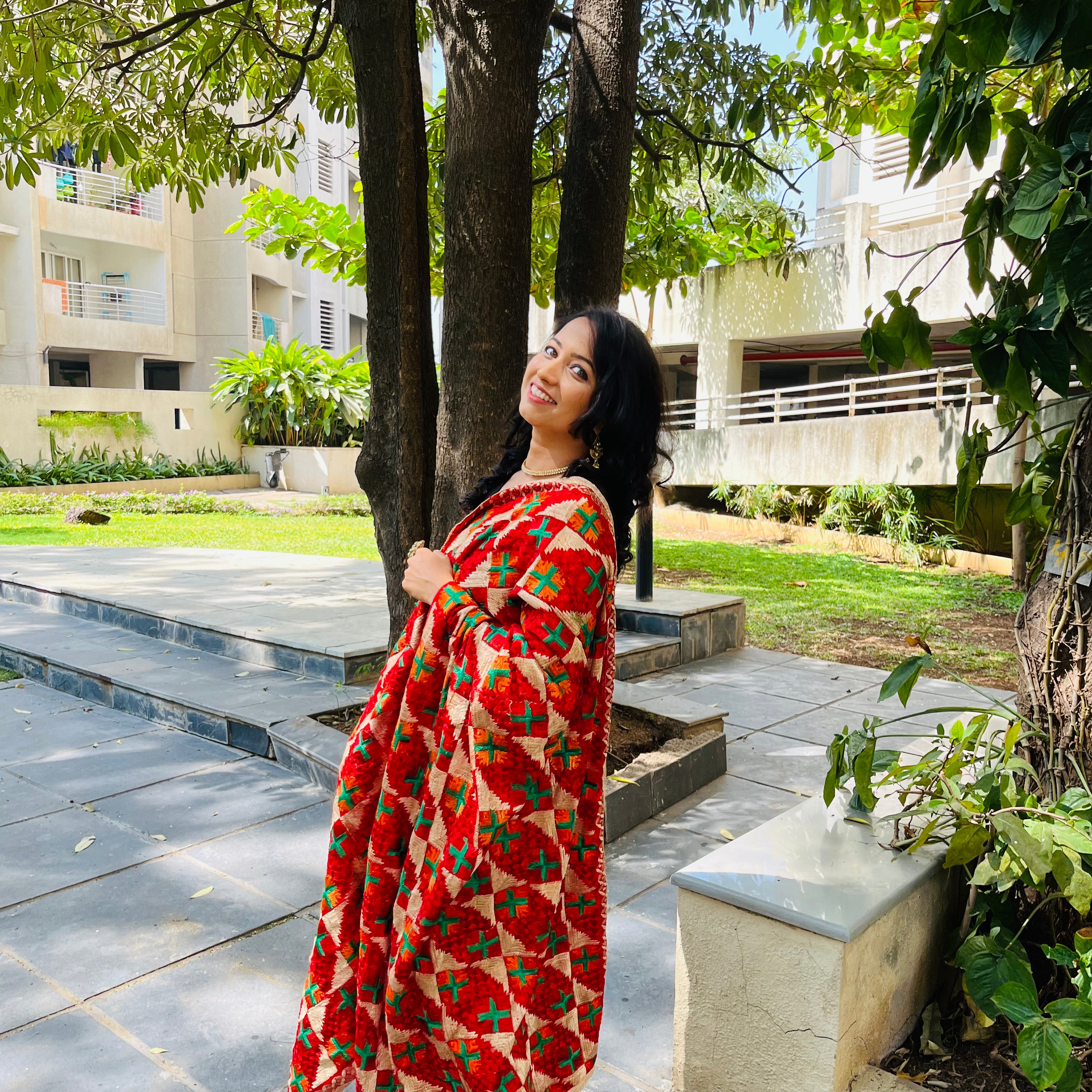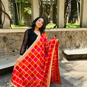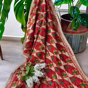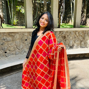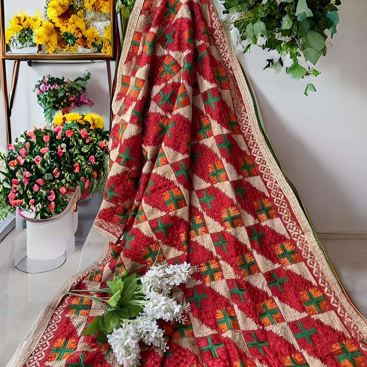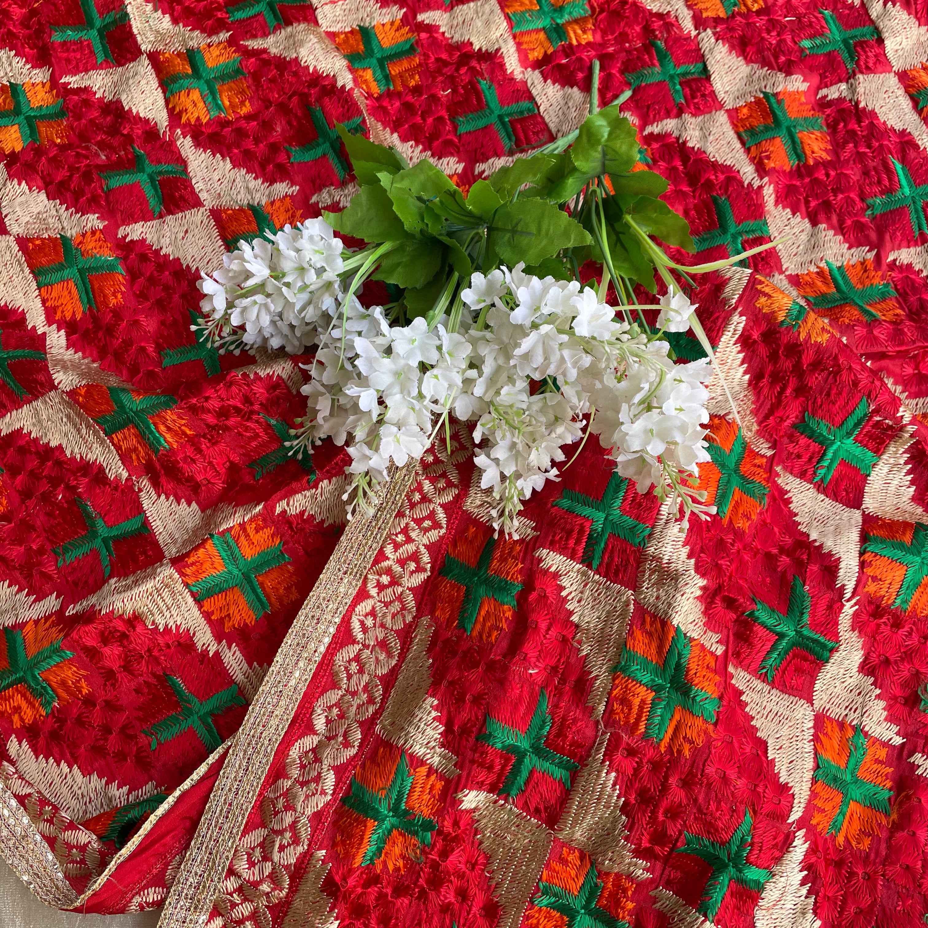 This sparkly phulkari dupatta with multicoloured threadwork for a dazzling look. Ideal for all occasions.is ideal for small celebration or traditional occasion. It has a Red base with floral motifs machine-embroidered in multicoloured thread on the entire fabric. Pair it with a lehenga or kurta. Add oodles of elegance with this dupatta.