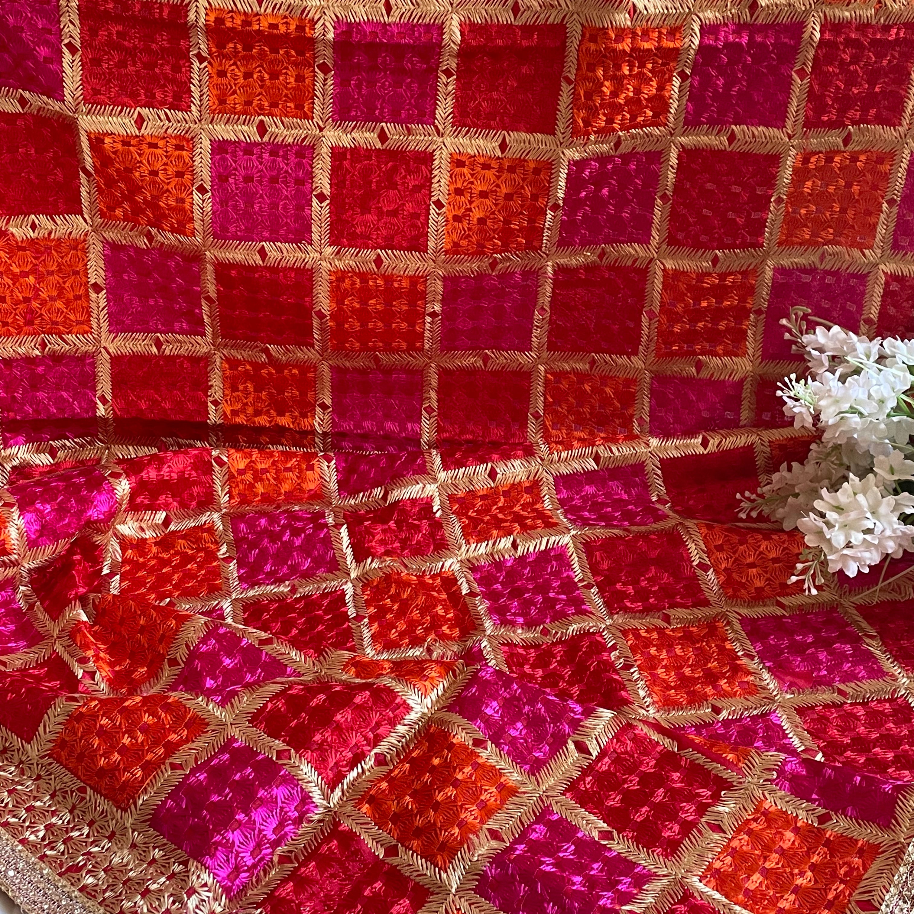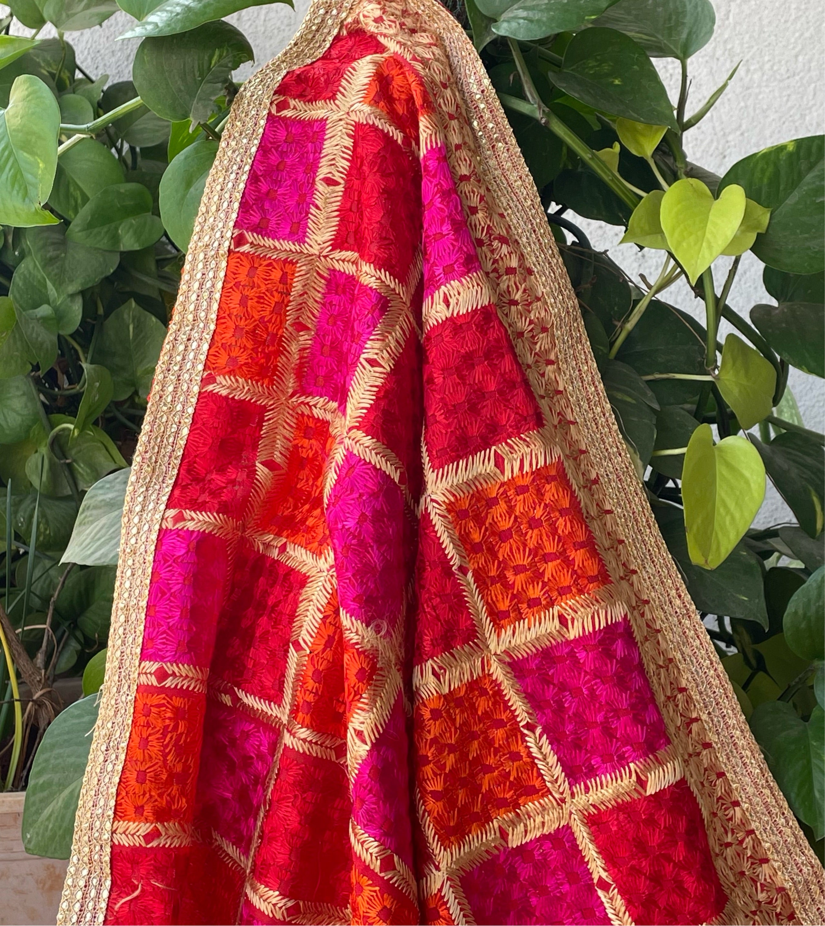 Phulkari Machine-Embroidered Chinnon Dupatta - Red and Pink