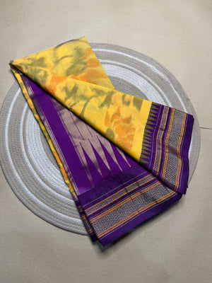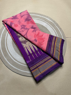 The cat design Pochampalli reflects classic Ilkal artistry, while the temple border adds understated elegance, making it perfect for casual wear, office, or festive occasions. Lightweight and breathable, this saree is an effortless way to embrace timeless style.