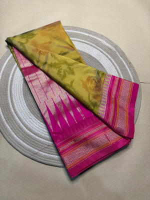Celebrate tradition with a modern touch in our Chikki Paras. with temple Semi Silk Saree. Woven from fine mercerised cotton, this saree is soft, durable, and drapes gracefully.