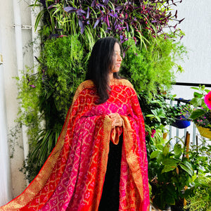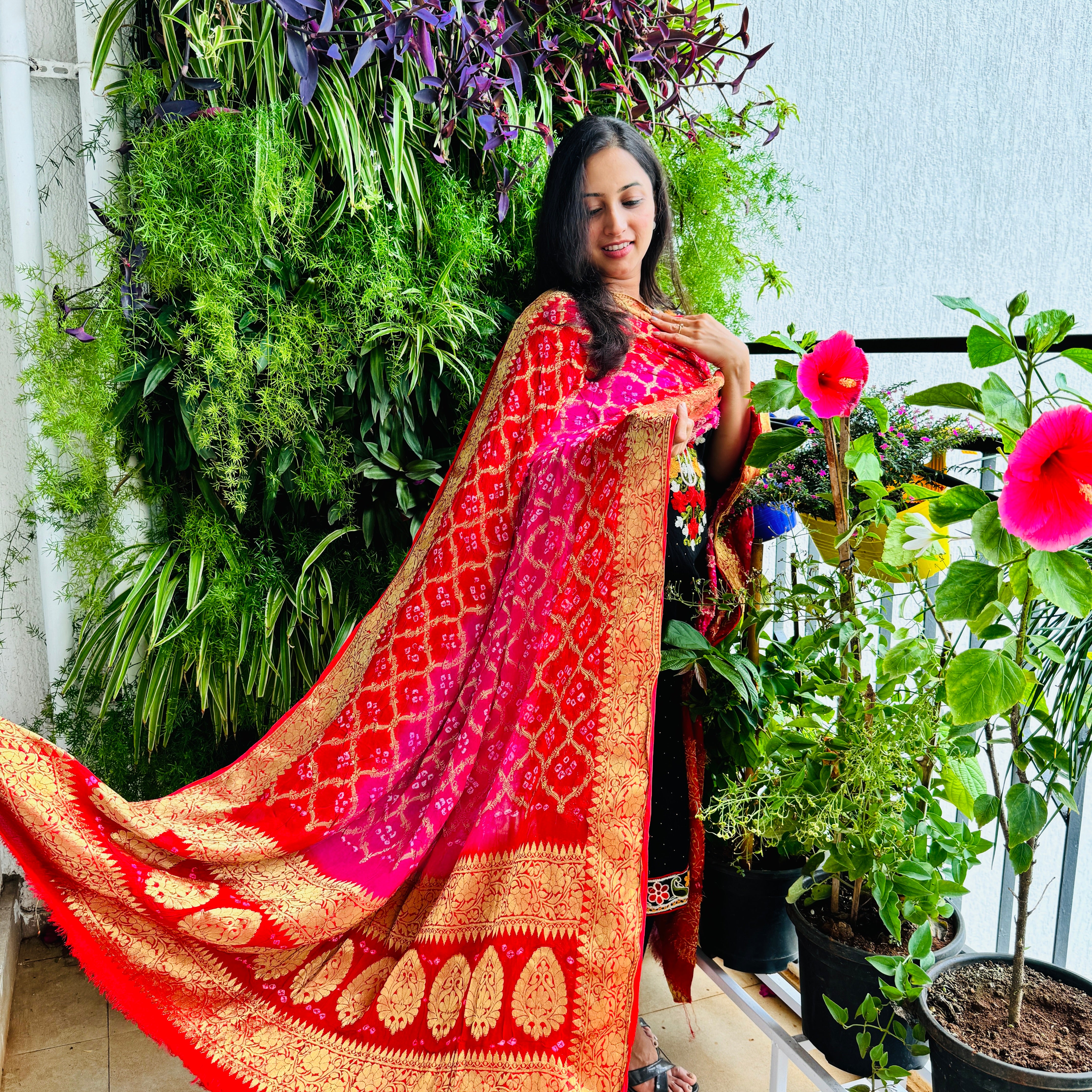 A superd choice for festivities, this pink and red Banarasi-Bandhani dupatta is handcrafted in flowy georgette fabric. The colours make it an obvious mood elevator, and the gold only enhances the overall apperance.