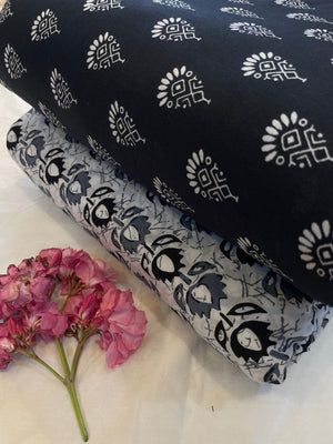 The Cotton Bagru fabric elevates the suit's elegance with its lightweight yet rich texture. Known for its breathable quality and subtle sheen, Bagru Cotton is the perfect choice for casual and Summer Wear. The The suit includes a Top material and Bottom material without dupatta with a sophisticated touch.