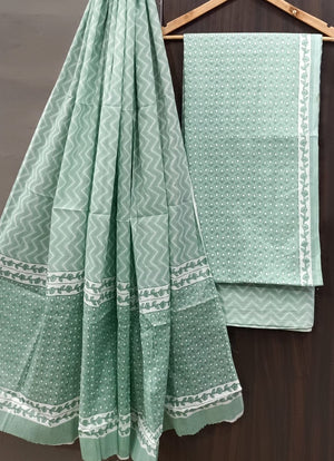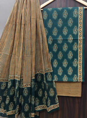 Pure hand block Cotton Bagru- Unstitched 3 piece Suit Material Blue Green