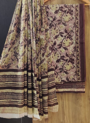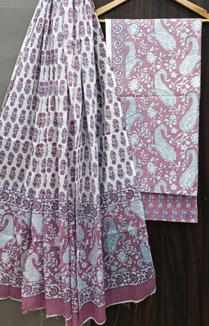 The Cotton Bagru fabric elevates the suit's elegance with its lightweight yet rich texture. Known for its breathable quality and subtle sheen, Bagru Cotton is the perfect choice for casual and Summer Wear. The suit includes a Top material and Bottom material with a soft dupatta to elevate a sophisticated touch.