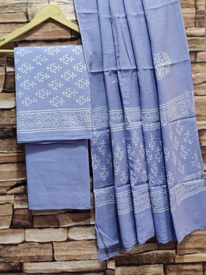 This unstitched Cotton suit features handcrafted Bagru prints that embody the rich heritage of Indian textile art. The Bagru printing technique uses organic dyes and hand-carved wooden blocks to create symmetrical and nature-inspired motifs, adding an earthy and authentic vibe to the outfit.