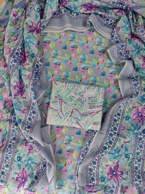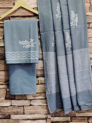 The Cotton Bagru fabric elevates the suit's elegance with its lightweight yet rich texture. Known for its breathable quality and subtle sheen, Bagru Cotton is the perfect choice for casual and Summer Wear. The suit includes a Top material and Bottom material with a soft dupatta to elevate a sophisticated touch.