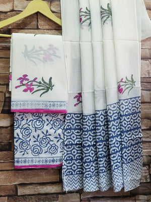 Pure hand block Cotton Bagru- Unstitched Suit Material With Beautiful Dupatta- White