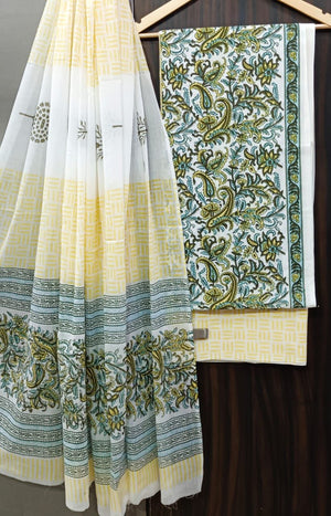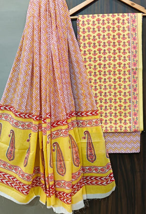 Pure hand block Cotton Bagru- Unstitched 3 piece Suit Material Yellow
