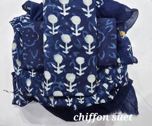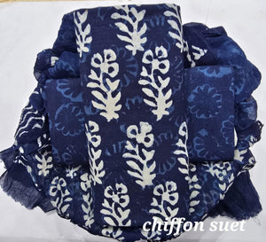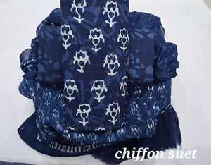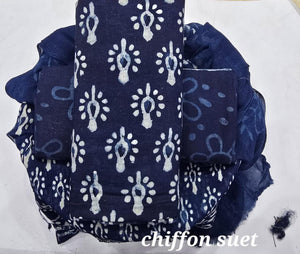 The Cotton Bagru fabric elevates the suit's elegance with its lightweight yet rich texture. Known for its breathable quality and subtle sheen, Bagru Cotton is the perfect choice for casual and Summer Wear. The suit includes a Top material and Bottom material with a soft dupatta to elevate a sophisticated touch.