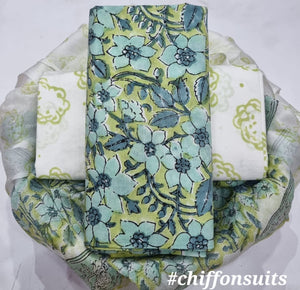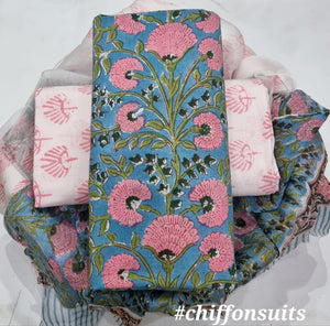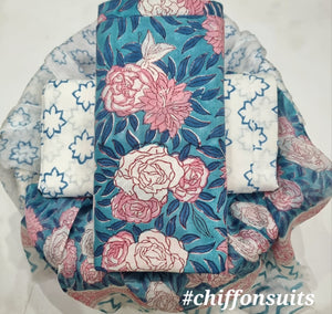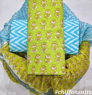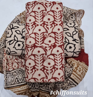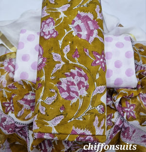 The Cotton Bagru fabric elevates the suit's elegance with its lightweight yet rich texture. Known for its breathable quality and subtle sheen, Bagru Cotton is the perfect choice for casual and Summer Wear. The suit includes a Top material and Bottom material with a soft dupatta to elevate a sophisticated touch.