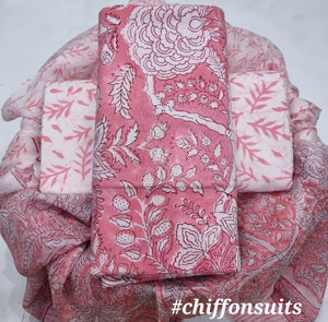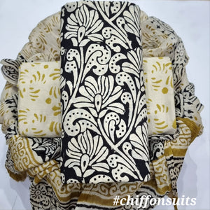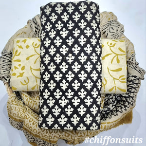 The Cotton Bagru fabric elevates the suit's elegance with its lightweight yet rich texture. Known for its breathable quality and subtle sheen, Bagru Cotton is the perfect choice for casual and Summer Wear. The suit includes a Top material and Bottom material with a soft dupatta to elevate a sophisticated touch.