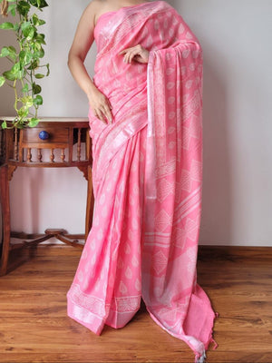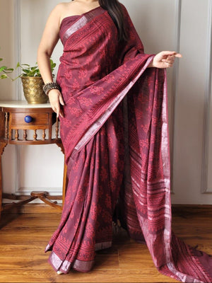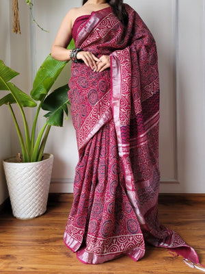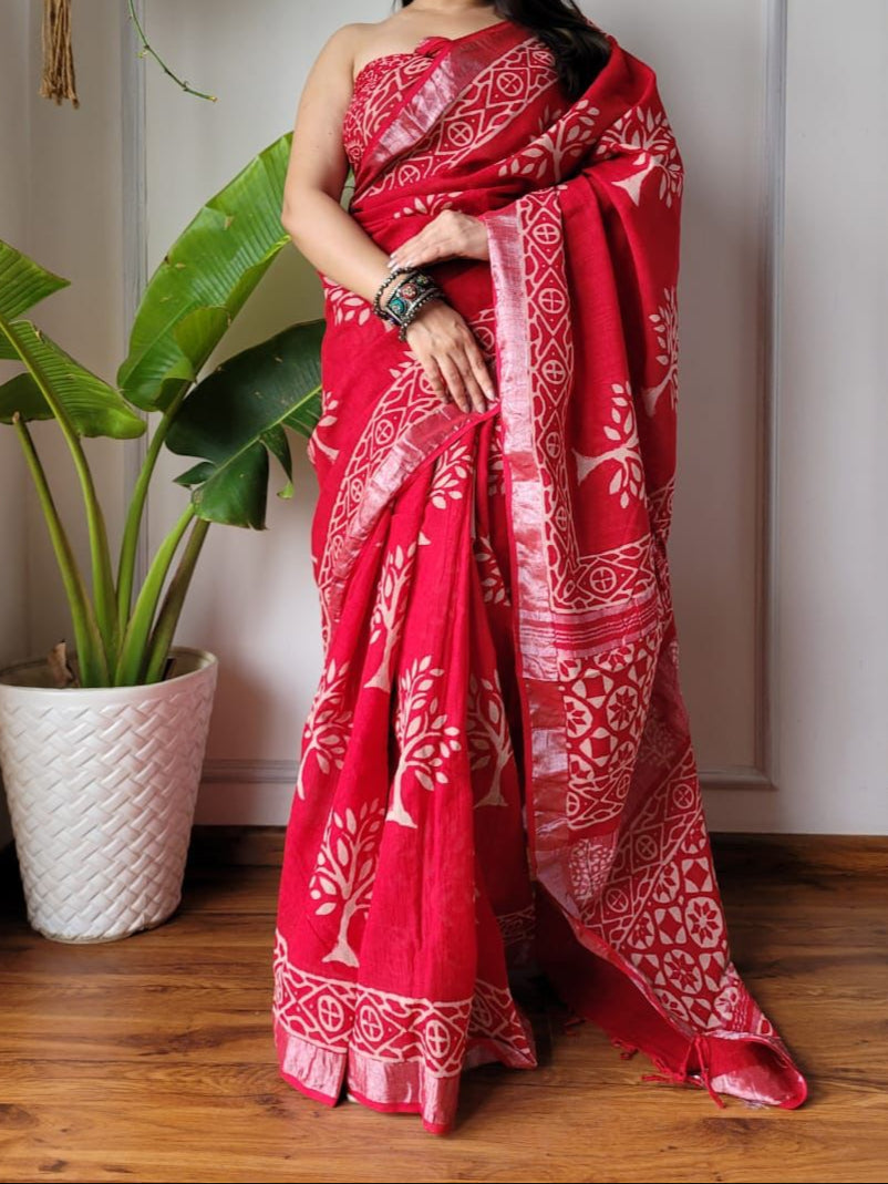 Make an impact with this gorgeous saree that showcases the age-old craft of Bagru printing. This high-quality cotton linen fabric provides outstanding breathability, keeping you cool and comfortable all day.