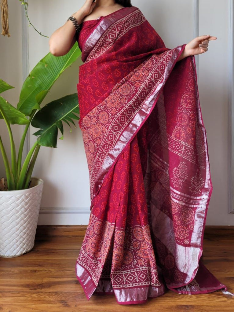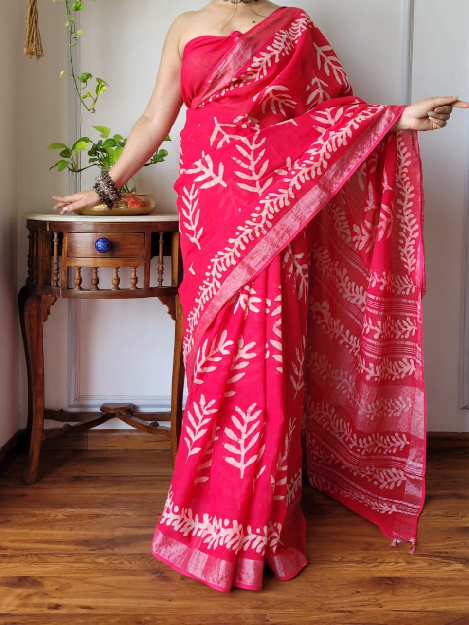 Bagru Hand Block Printed Cotton Linen Saree - Vibrant Flora (With Blouse). Light, cool and comfortable Mul Cottons in lovely Bagru prints. Bagru block printing done by the chippas (block printers) in the Bagru region of Rajasthan is a traditional technique of printing with natural colour mostly on light coloured backgrounds with wooden blocks, following a direct-to-surface as well as a resist printing methodology.