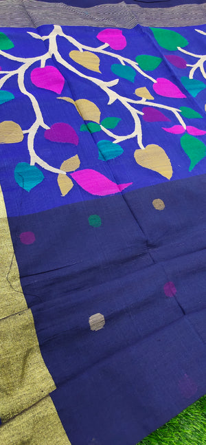 This pure maslin pallu jamdani saree is an ideal pick for small gatherings and traditional festivities. It is light-weight, easy to carry and comfortable. This saree is dark blue with leaf motifs on the pallu. To add to charm, it has a gold zari woven border. Beautifully handcrafted the our rural artisans, this jamdani beauty is sure to make to stand from the crowd.