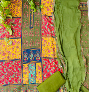 This Pure Cotton salwar suit fabric is perfect for everyday office wear and casual wear. For women who love punjabi long style, this salwar suit is an ideal choice. It will give you a vibrant and ethnic feel. The Kurta is olive green in color with multi coloured design panels. Dupatta is in chiffon material with elegant borer. Kurta and bottom are soft cotton fabric and come unstitched.