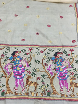 Pure Tussar Silk Kantha Stitch dupatta - Cream - Shakuntala