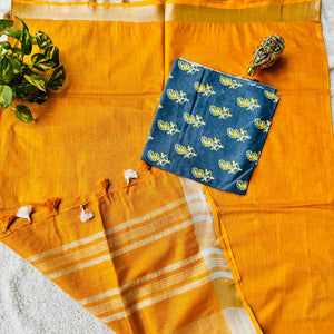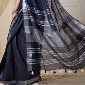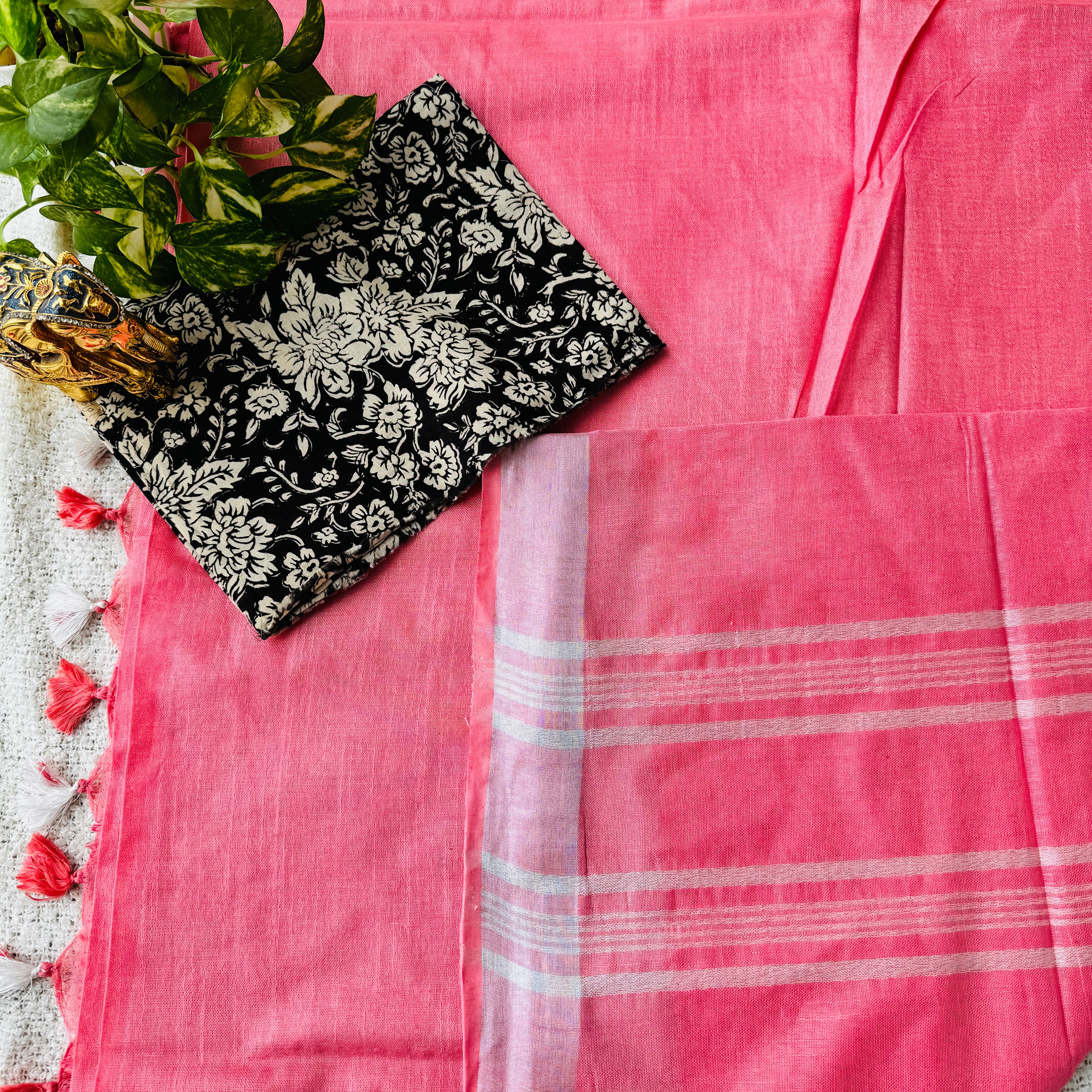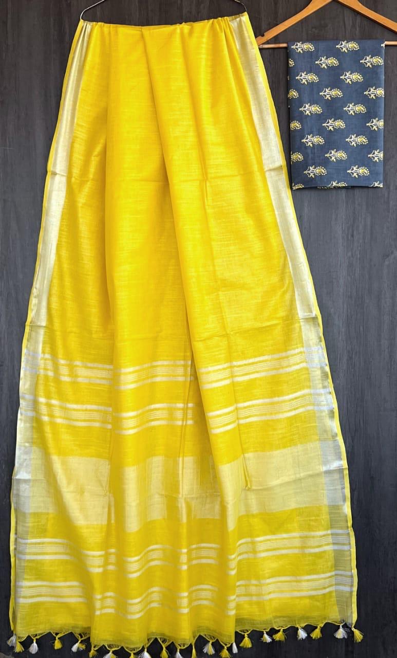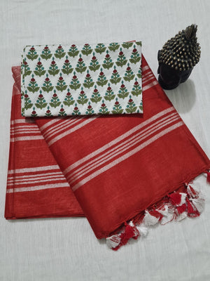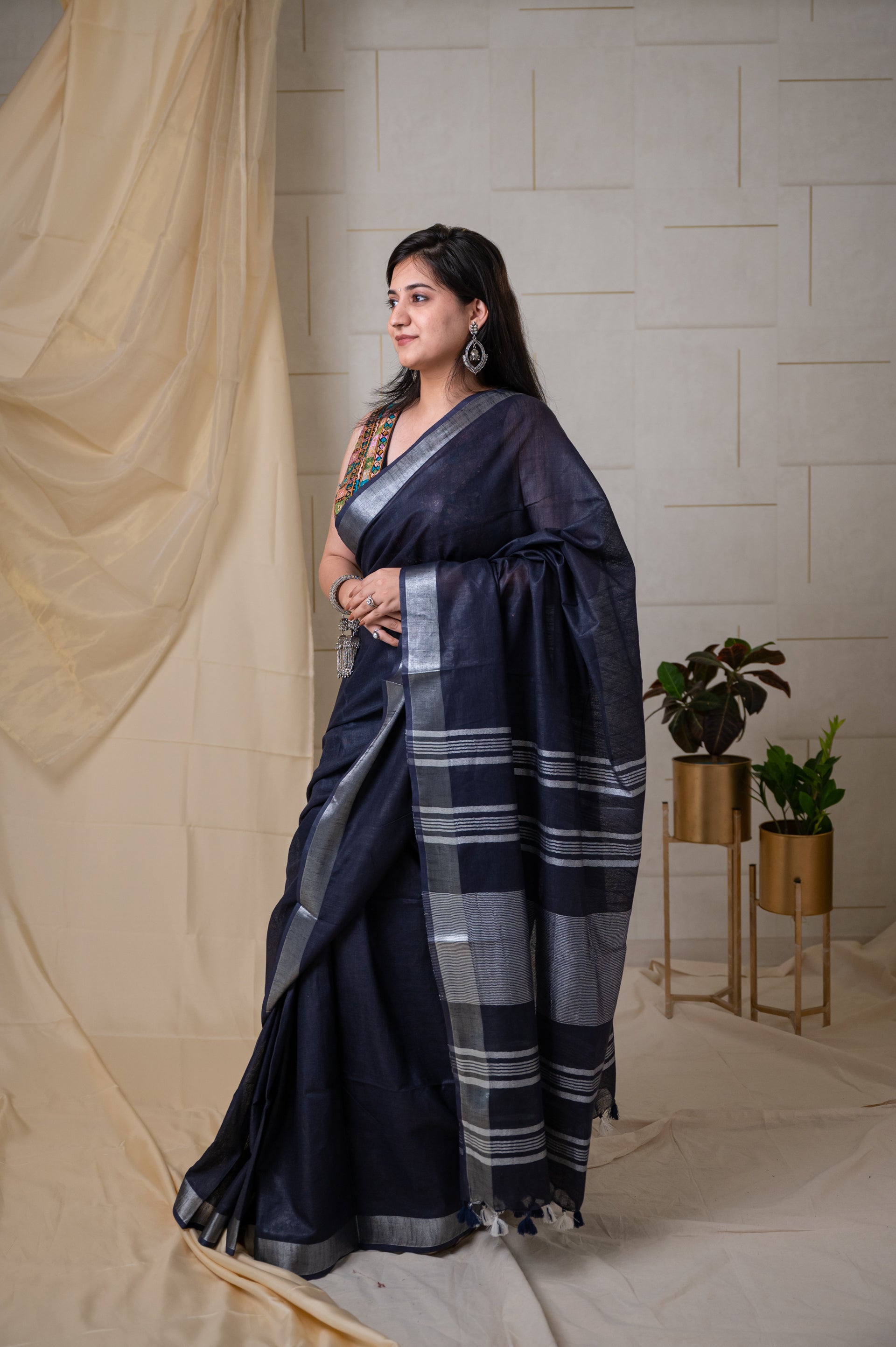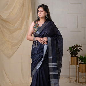 Presenting a beautiful Handloom Saree in cotton linen with a small elegant border and contrast hand block printed blouse. The pallu of this saree features zari streak.