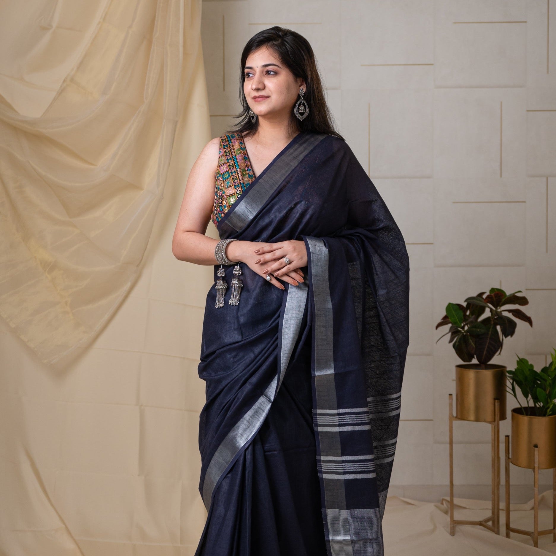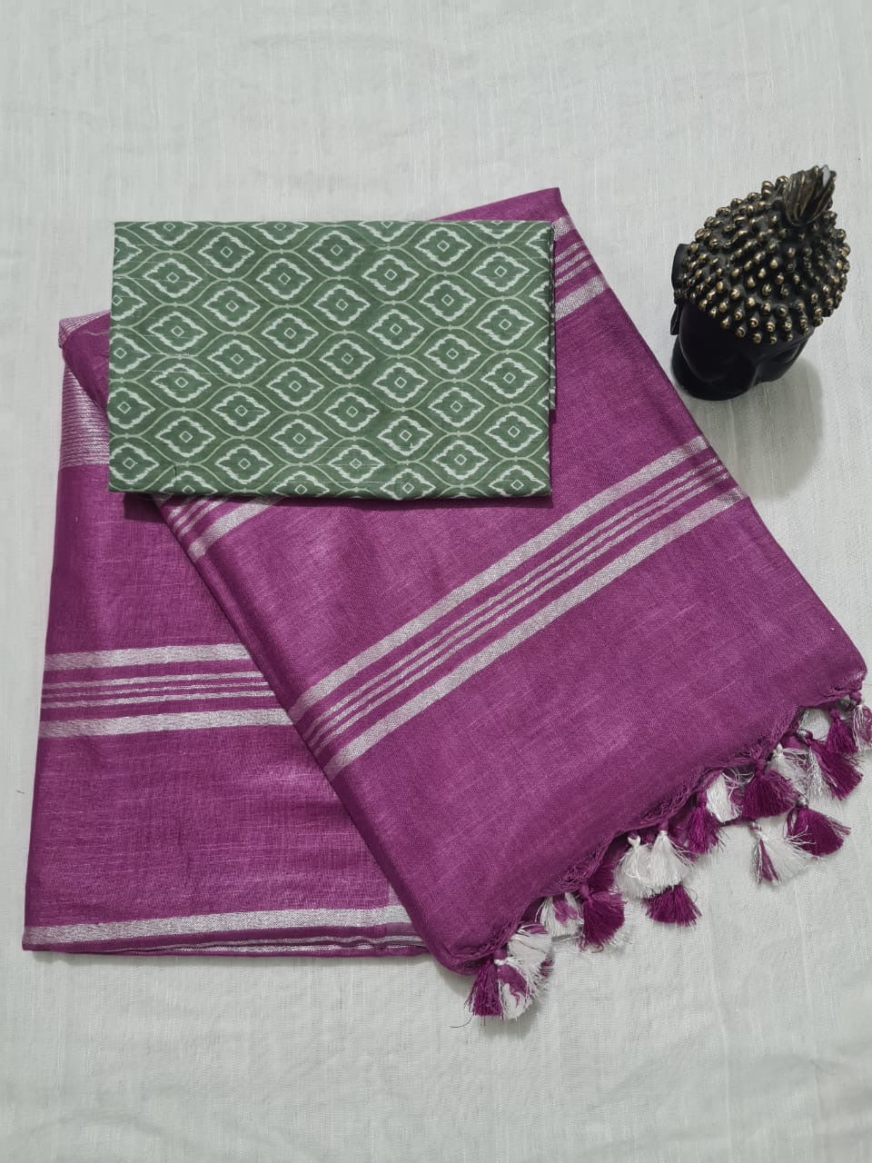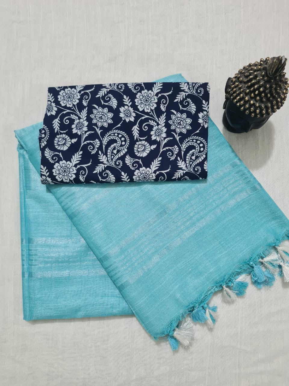 Cotton Linen Silver Zari Saree With Beautiful Contrast Printed Blouse Piece