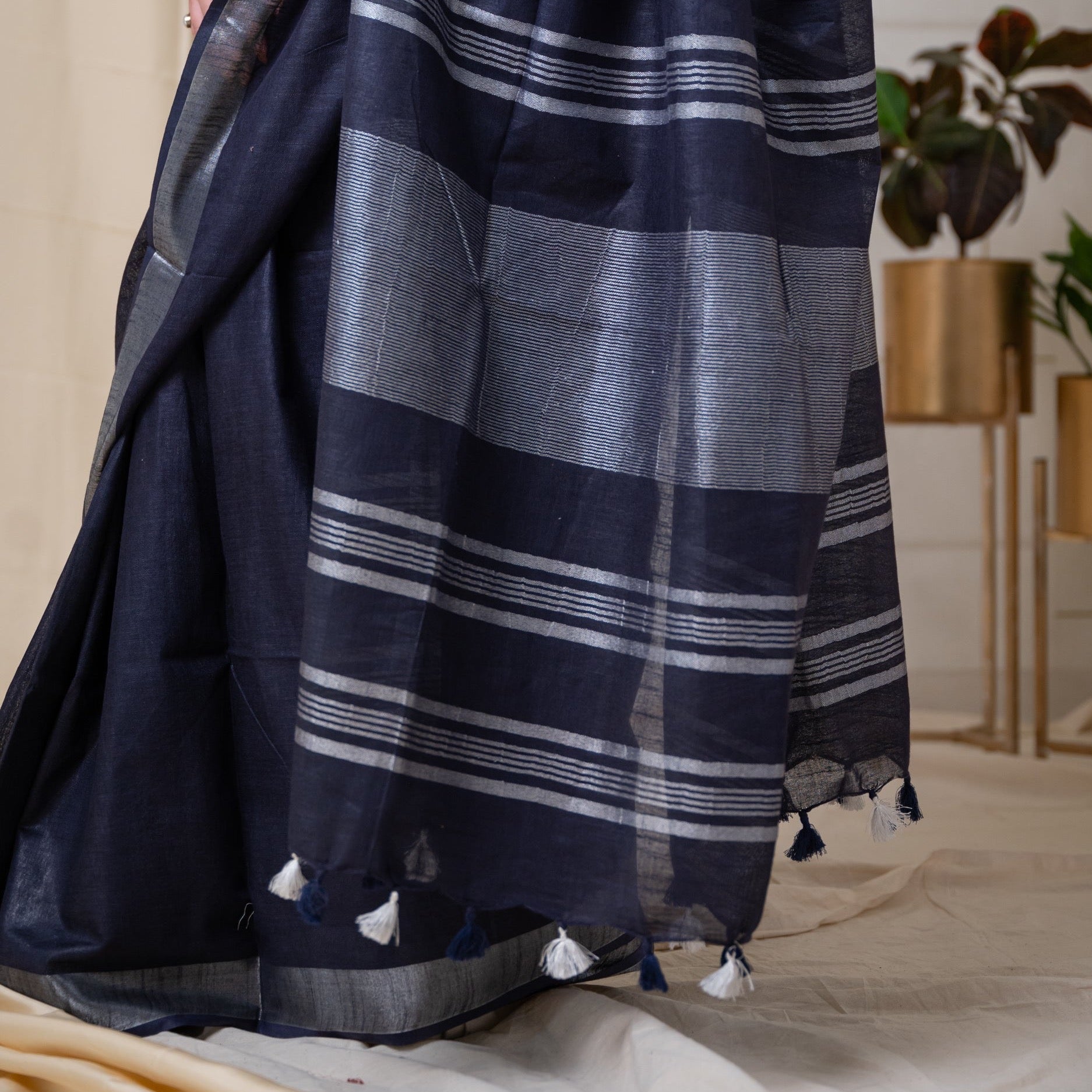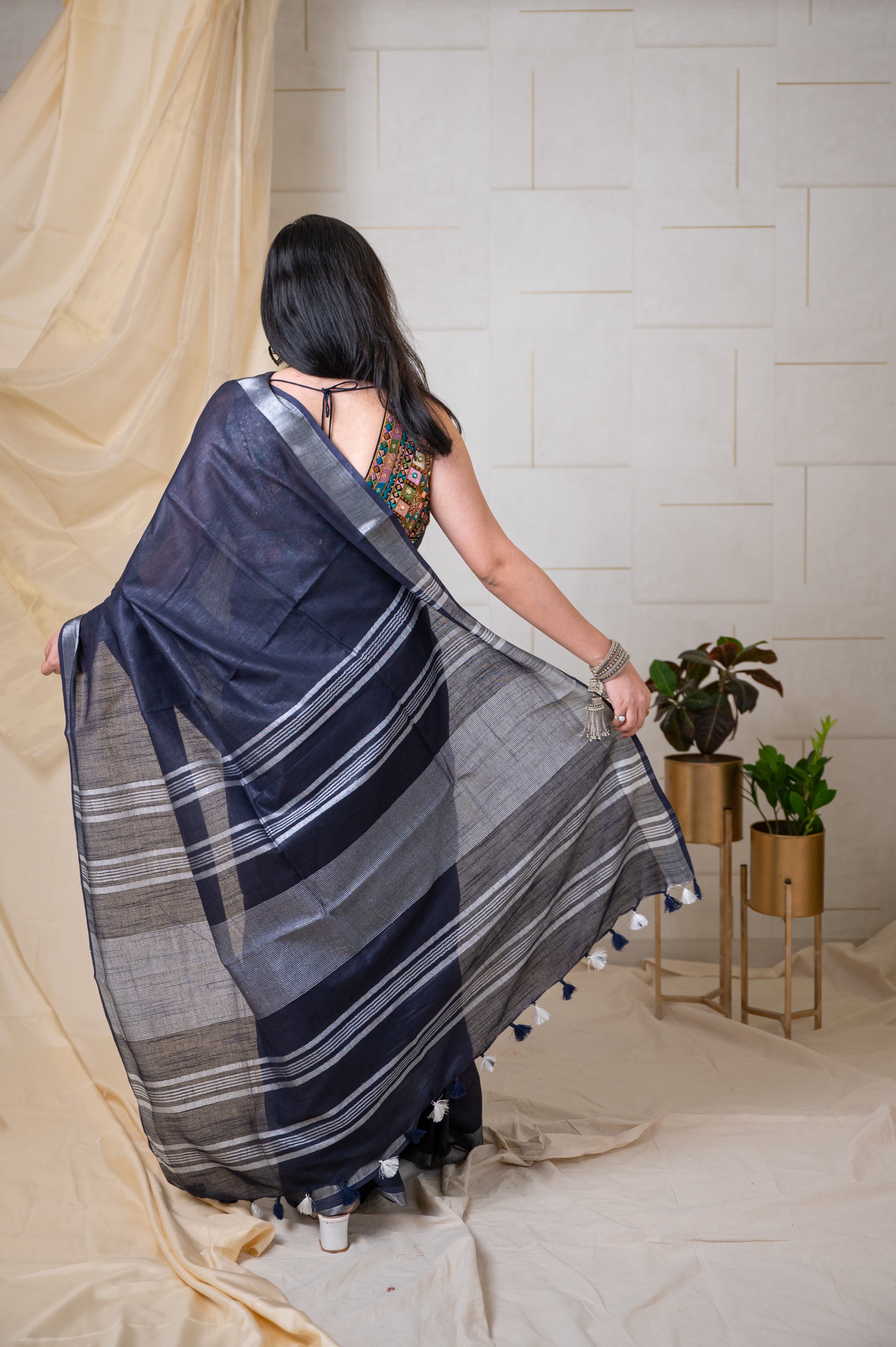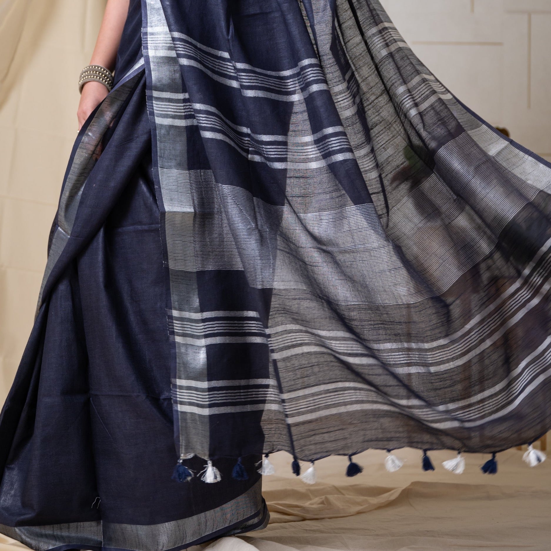 Cotton Linen Silver Zari Saree With Beautiful Contrast Printed Blouse Piece