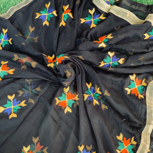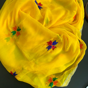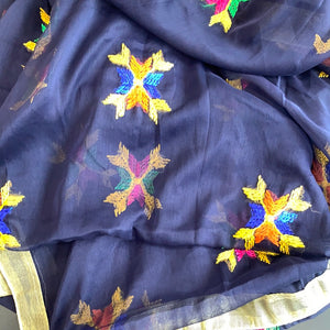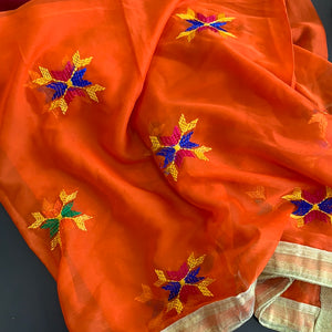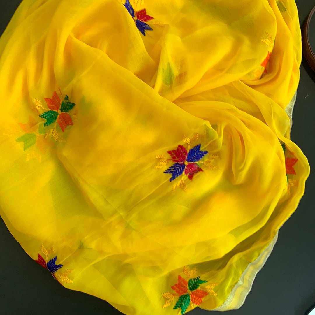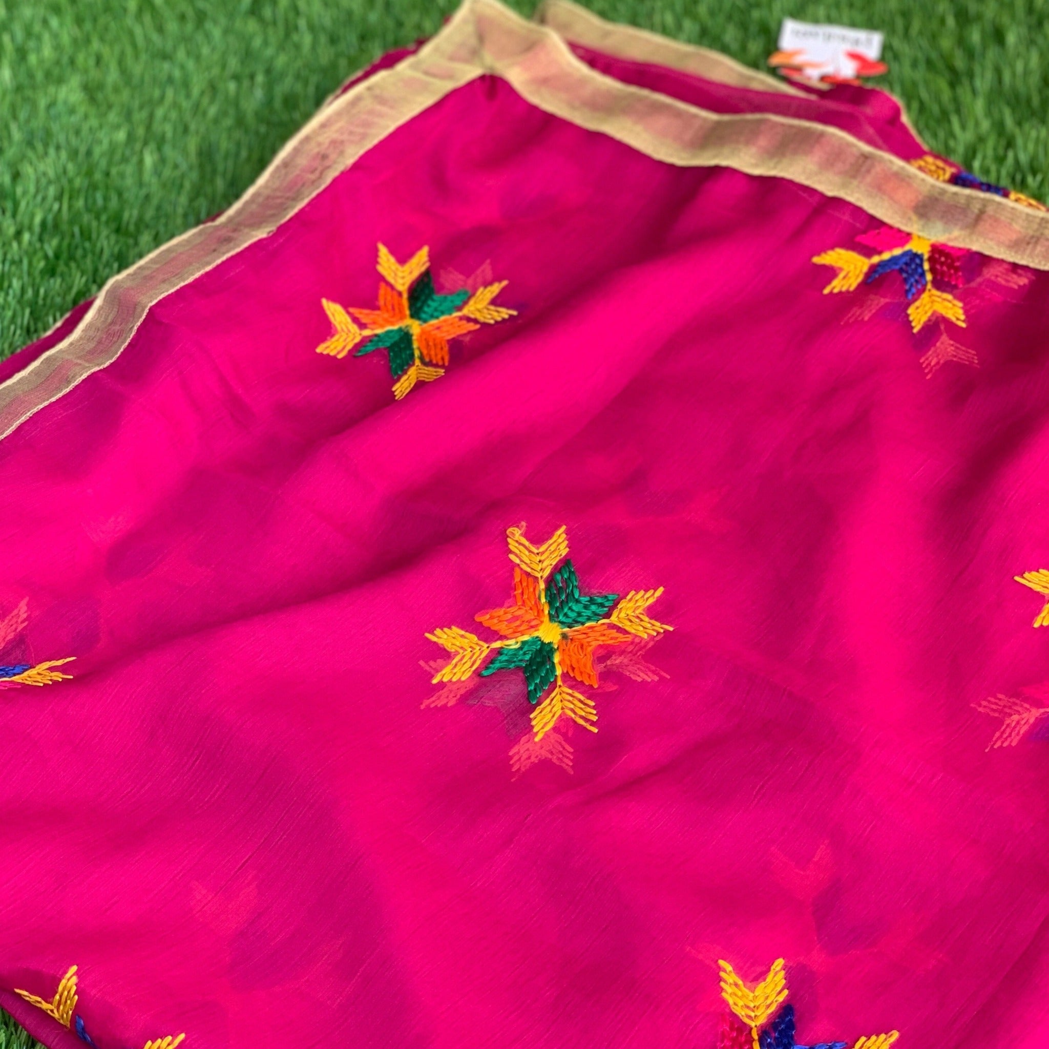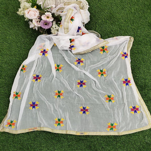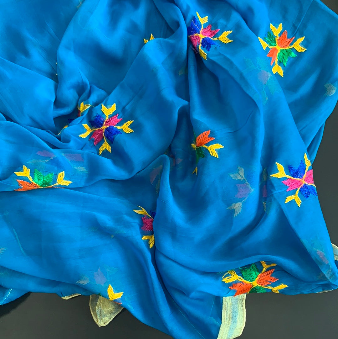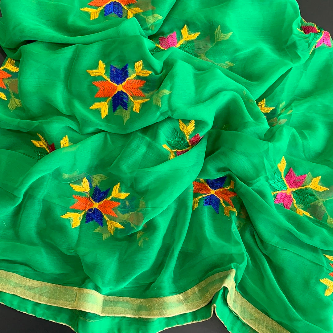 This Phulkari dupatta in chiffon with multi-coloured thread work is for the minimalist, with simple floral design. Team it up with any solid kurta for complete look.