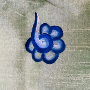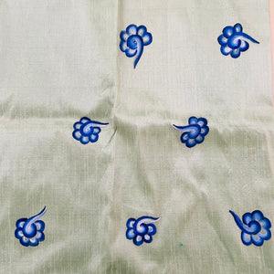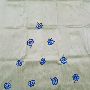 This Pista green hand painted Dupion Silk fabric has Floral one stroke painting as the bottom and also on sleeves. It has a unique blue floral motifs. A classic piece that can be worn with any dupatta or bottomwear for a smart look.