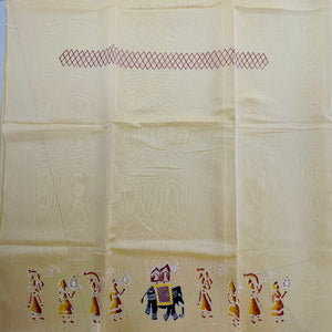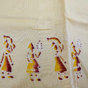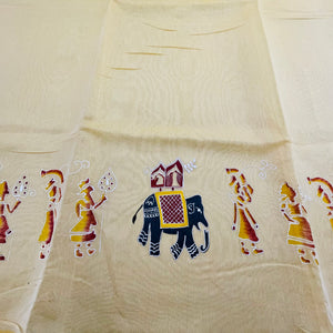 This hand painted cotton kurta fabric has an abstract design of an indian procecession as the bottom and has a beautiful hand painted border for sleeves. A classic piece that can be worn with any dupatta or bottomwear for a smart look.